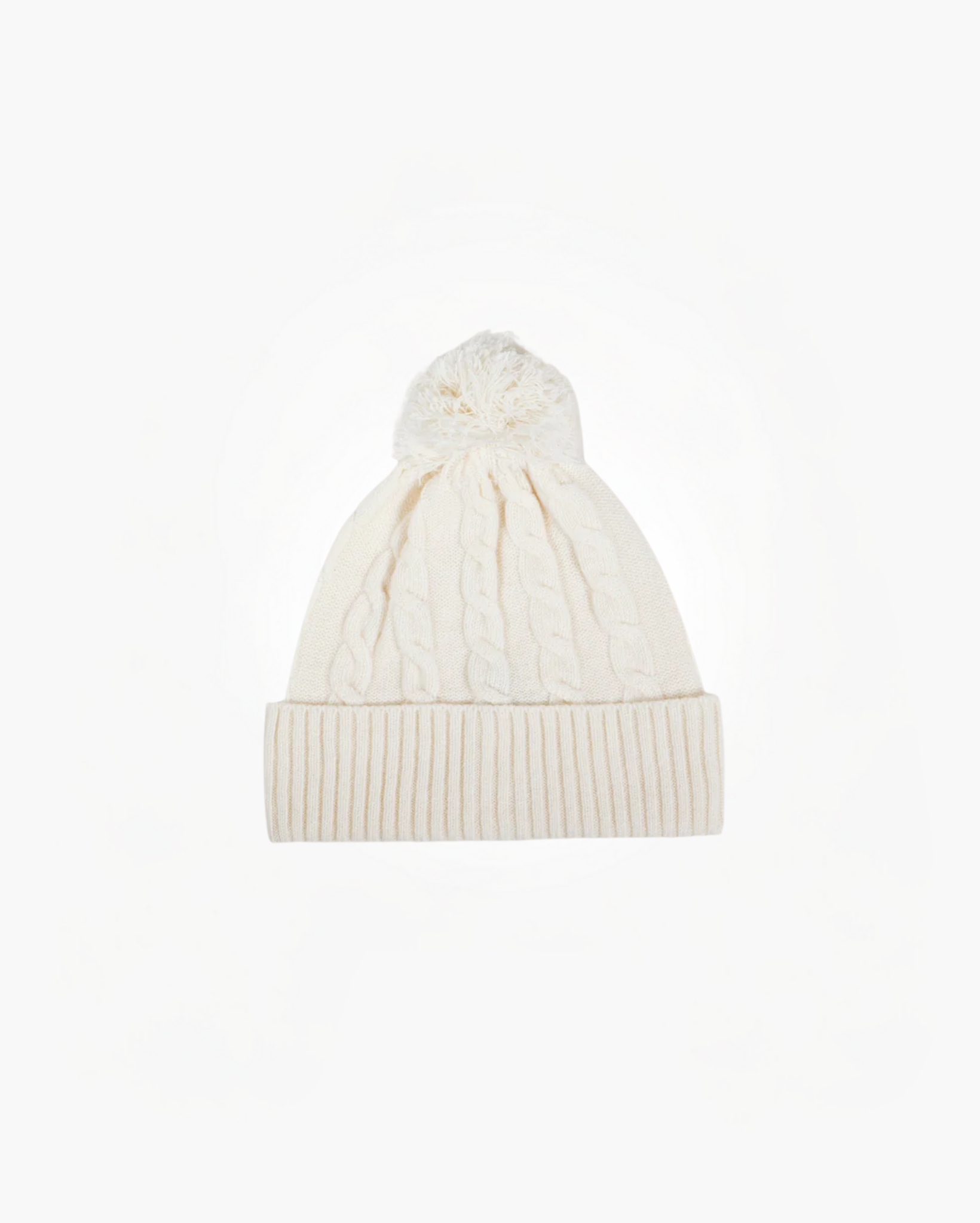 This cable-knit hat adds a relaxed, slouchy touch to your winter look, complete with a pompom for added charm. The pompom adds a hint of fun, making this hat a great choice for anyone who loves comfortable, stylish winter accessories. 100% Cashmere. Made in Mongolia.