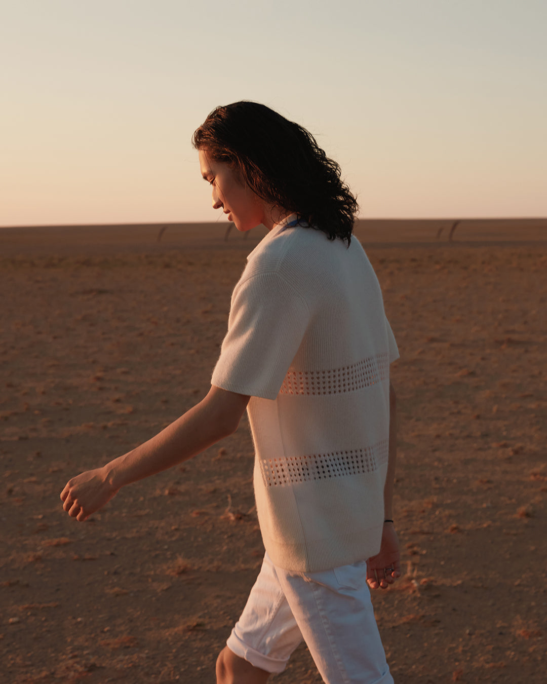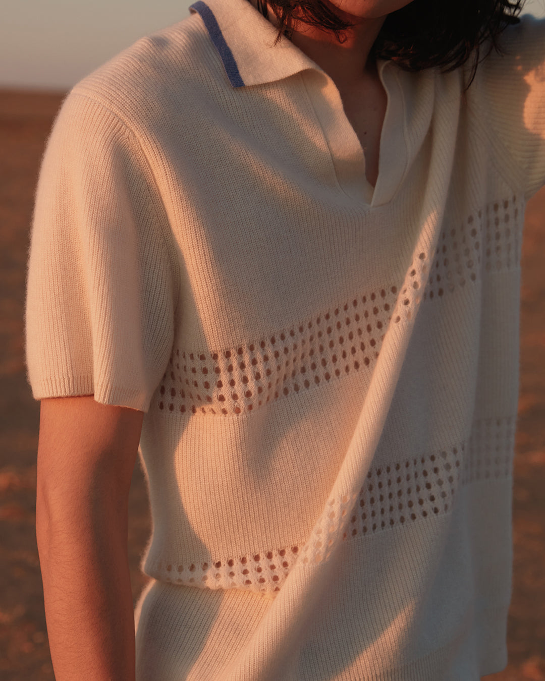 Designed in lightweight Mongolian cashmere, this contrasting color-trimmed-on shirt makes it easier to dress for smart-casual occasions. The design is featured by Ajour knit details. 100% Cashmere. Made in Mongolia.