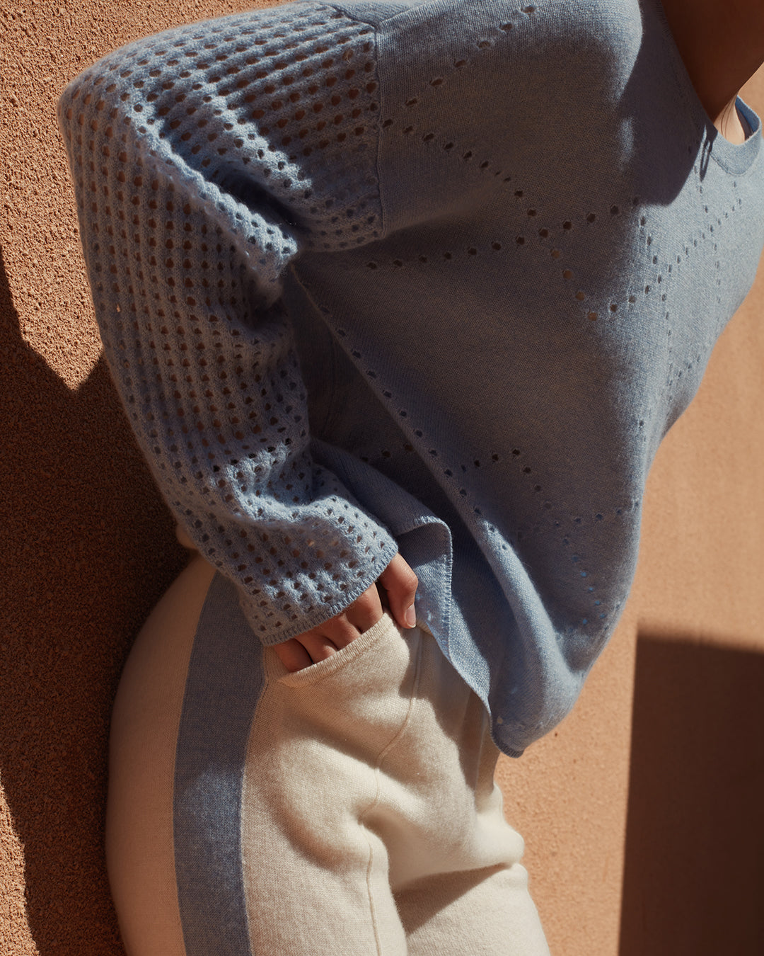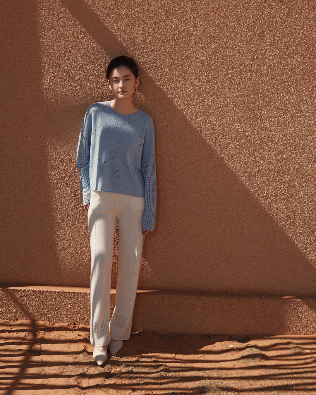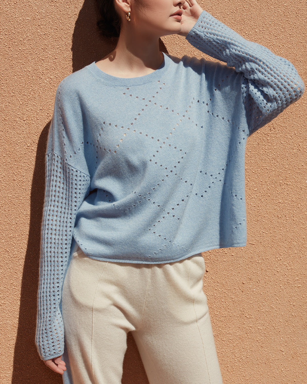 A perfect pointelle knit sweater that is essential for your wardrobe, and suitable to wear all year round. Crafted from the finest cashmere fiber, it is designed in Ajour and Pointelle knit stitches. The design has featured a crew neck, slightly dropped shoulder, and front details. 100% Cashmere. Made in Mongolia.