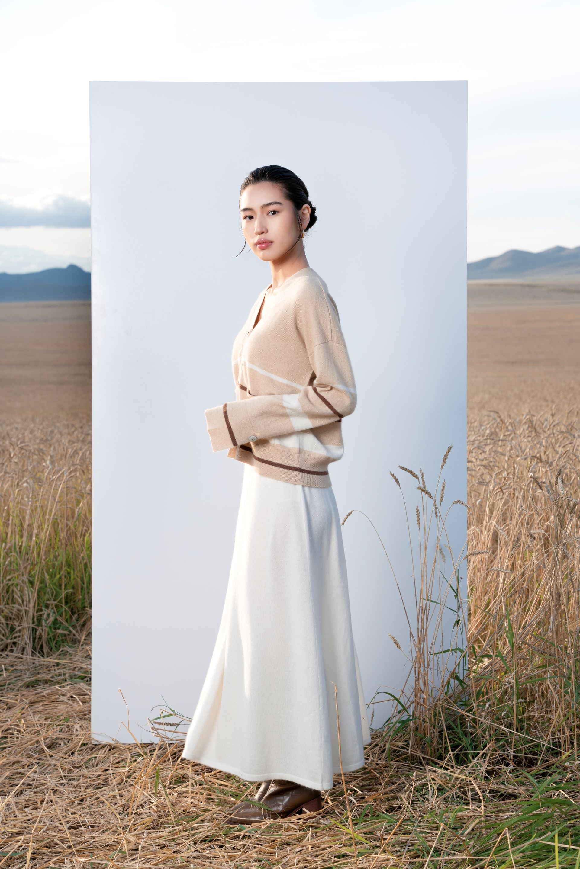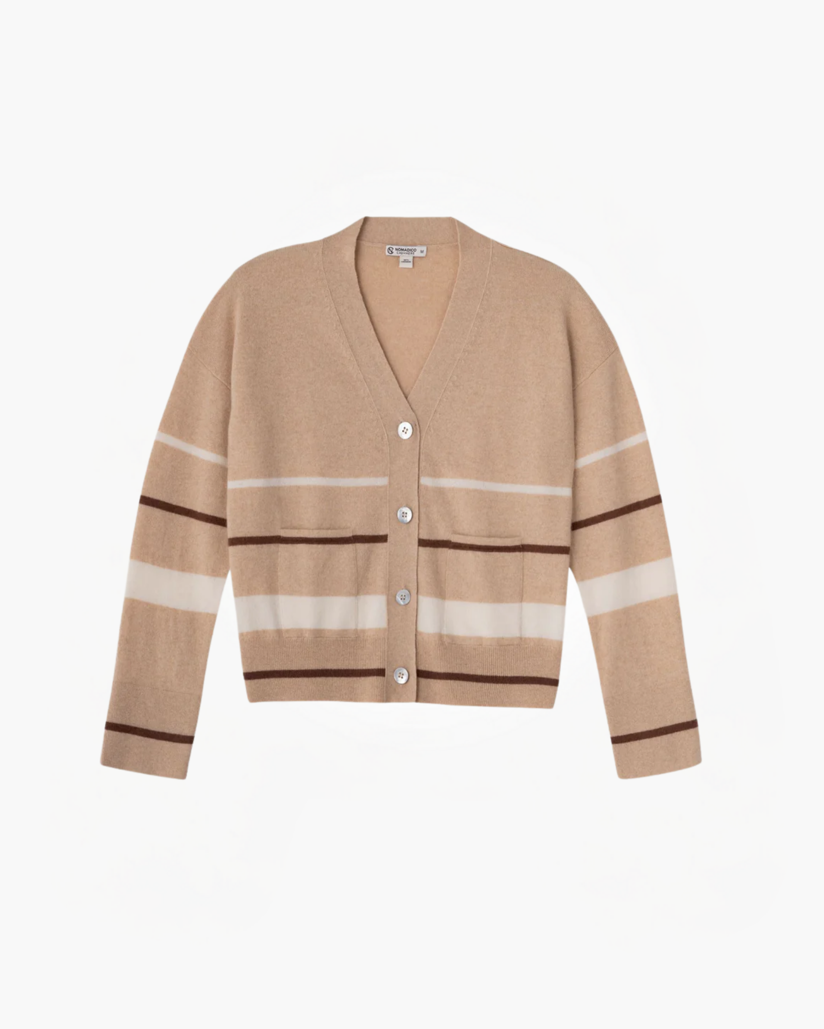 The classic v-neck design is accentuated by tasteful stripes that add a touch of modern flair to this elegant piece. With a lightweight yet cozy feel, this cardigan is perfect for layering during transitional seasons or as an extra layer of warmth on colder days. Featuring superior craftsmanship and exquisite softness, this cardigan embodies both versatility and refinement. 100% Cashmere. Made in Mongolia.