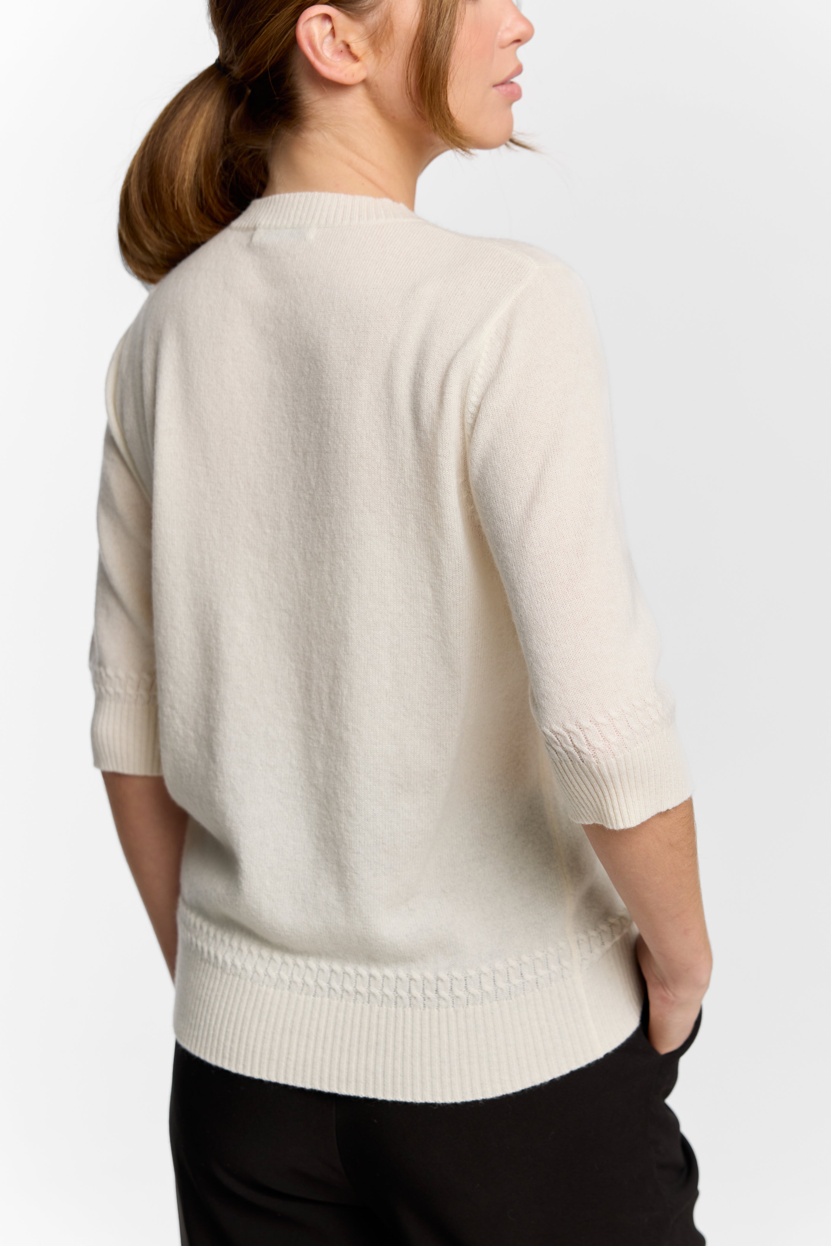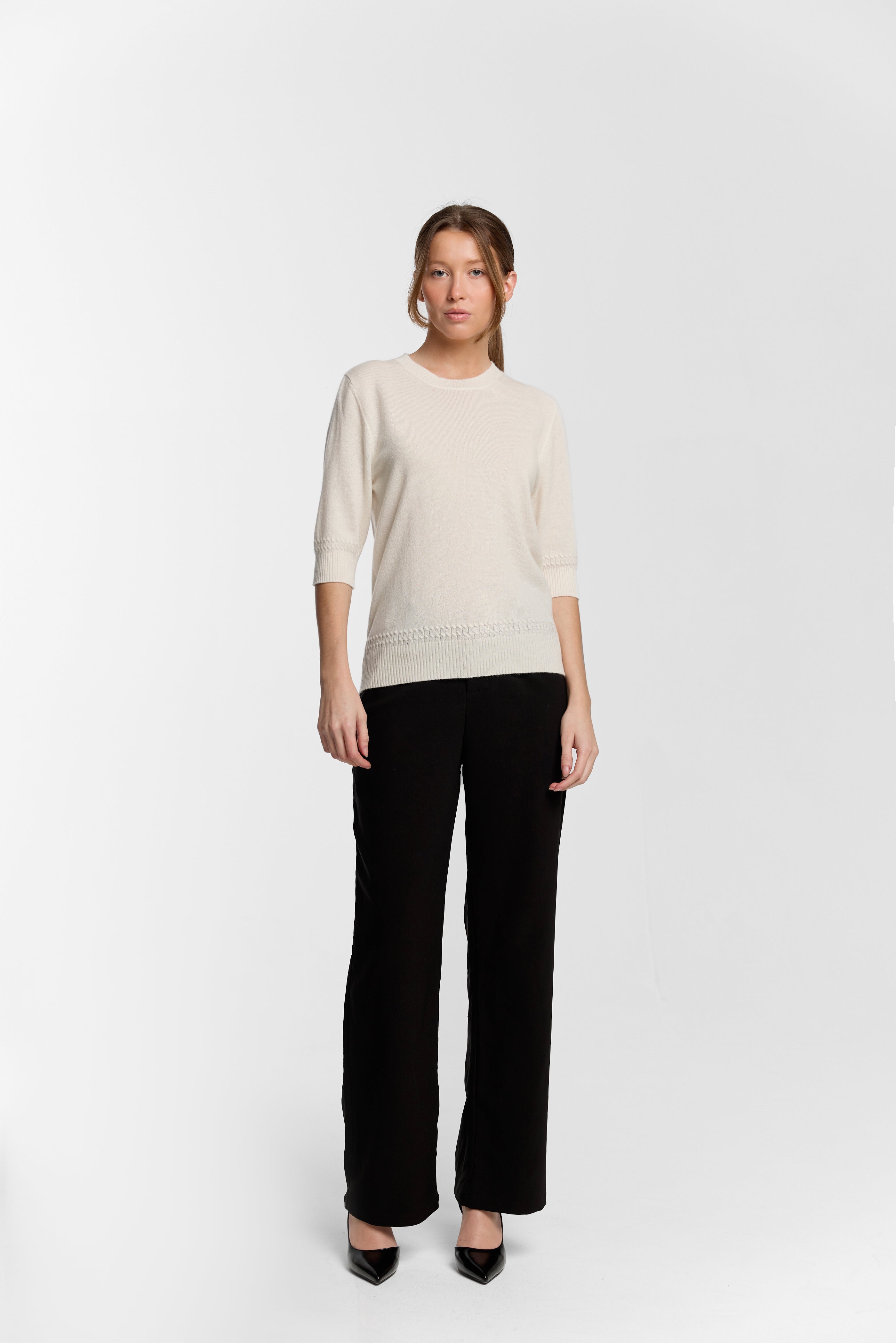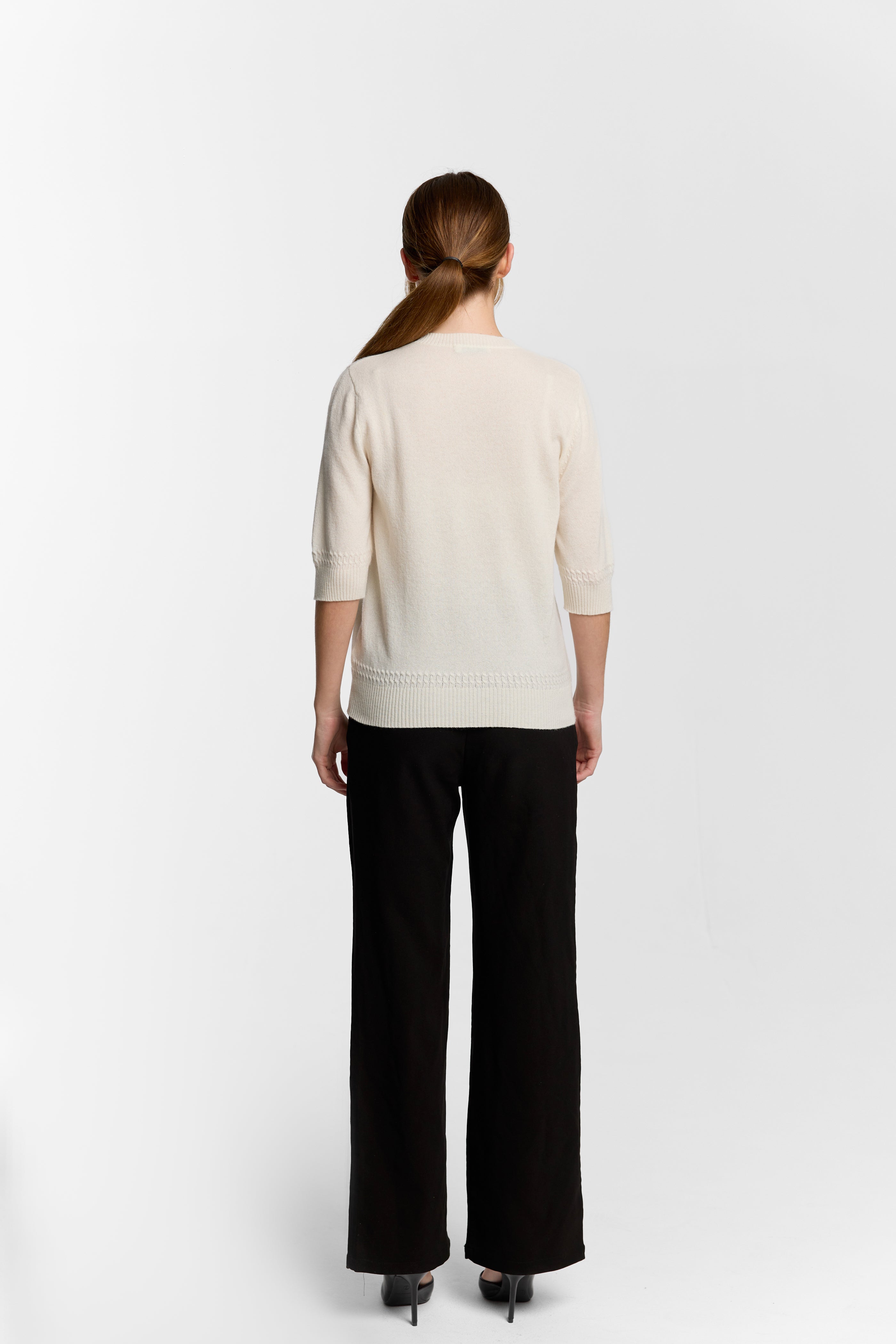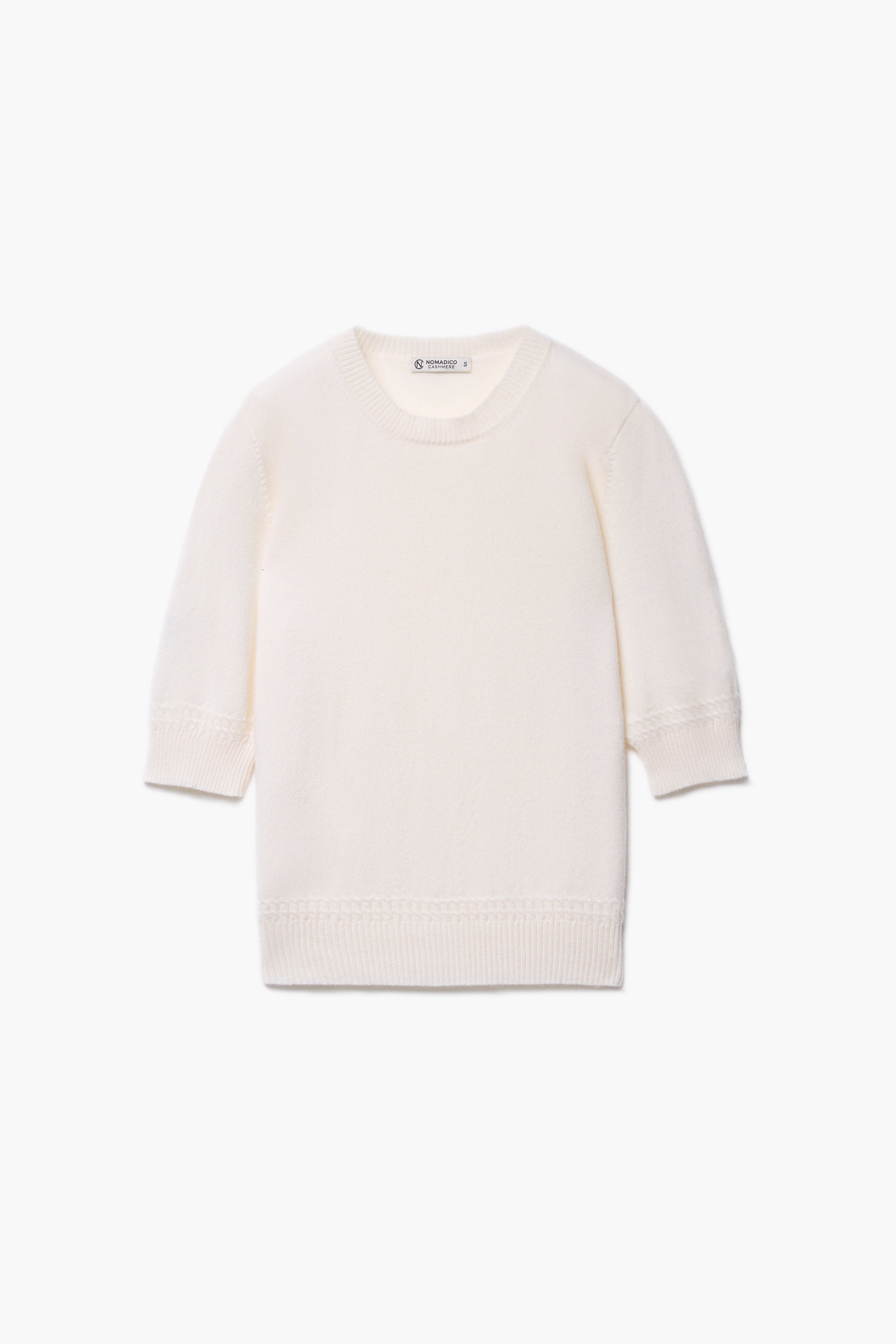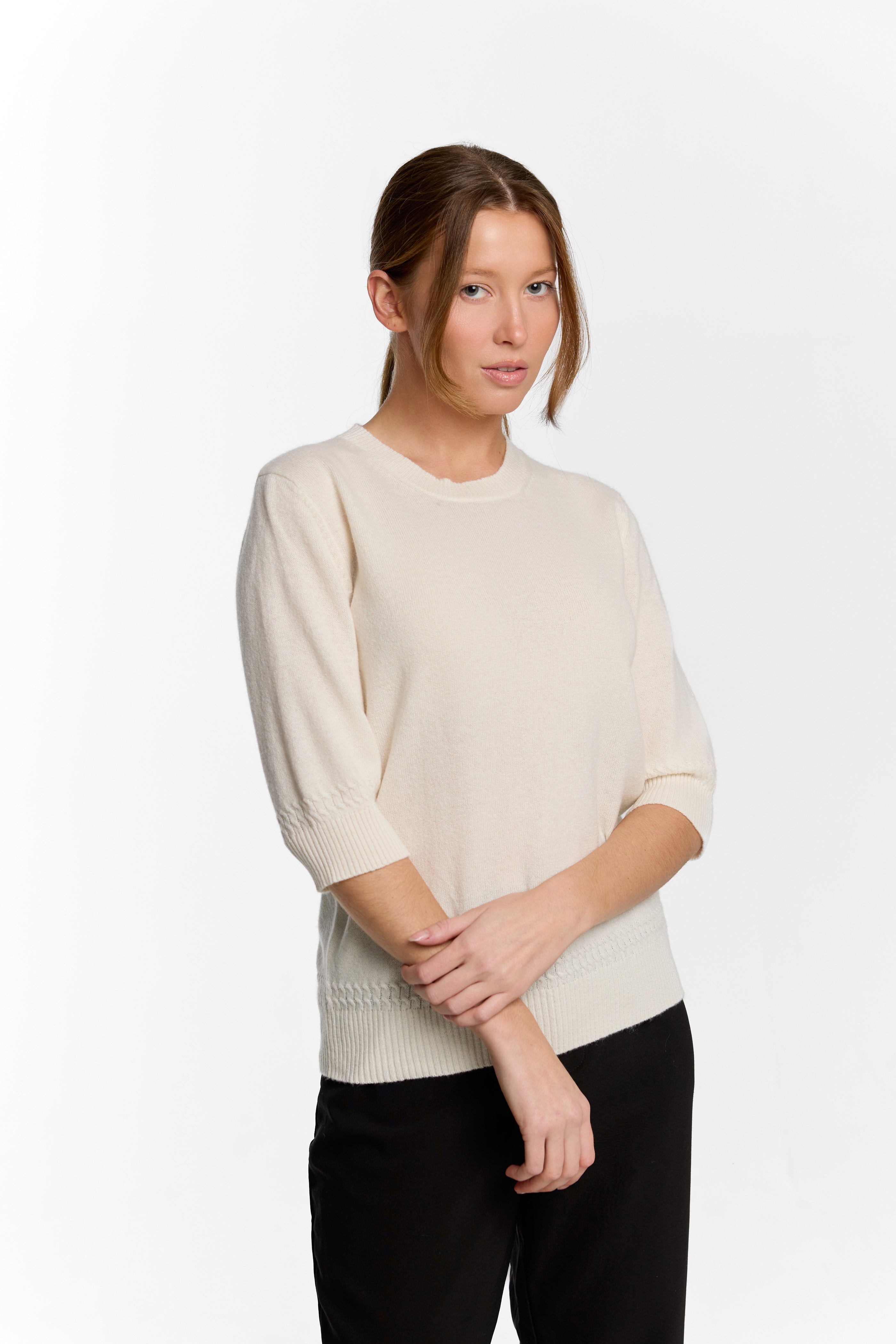 Short Sleeve Top crafted in cable knit attached at the hem and sleeve cuffs, round neck, and short sleeves. In a delicate dance of softness and strength, the short sleeve sweater combines the finest materials with intricate craftsmanship. This sweater slightly cropped fit that sits softly against the skin, inviting you to linger in its rich warmth. Designed to fit close to the body, this pretty piece is perfect for adding low-key indulgence to your everyday wardrobe.