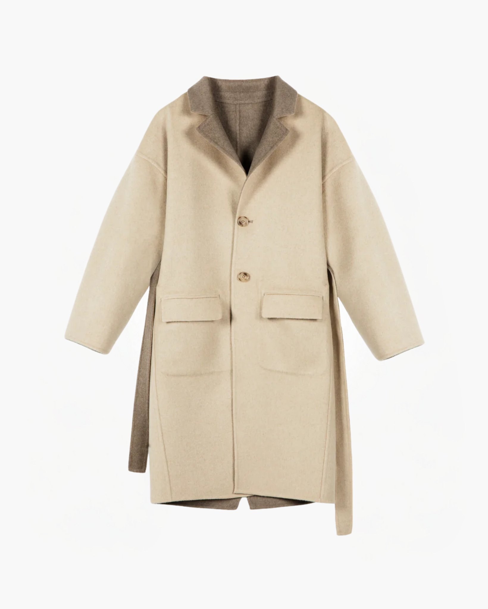 A cashmere lapel collar long coat exudes timeless sophistication and unparalleled comfort gives an option to wear both sides in two tones. The long length ensures ample coverage and adds to the dramatic, streamlined silhouette, making it ideal for both formal and casual occasions. 100% Cashmere. Made in Mongolia.